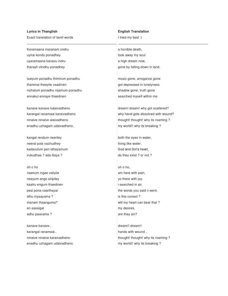 Tamil Song Lyrics In English Translation