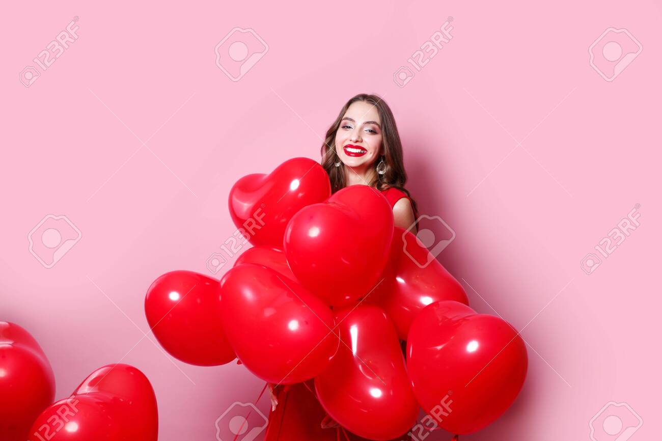 Happy Young Woman In Red Dress Celebrating Valentines Day Holding Stock Photo Picture And Royalty Free Image Image 139487659